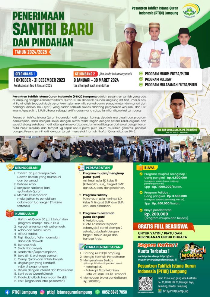 Pesantren Tahfizh Istana Quran Indonesia (PTIQI) di Lampung mempersembahkan program unggulan untuk para calon santri yang ingin mendalami Al-Quran dengan pendekatan yang komprehensif dan terbimbing. Berikut adalah beberapa alasan mengapa Anda harus memilih PTIQI: