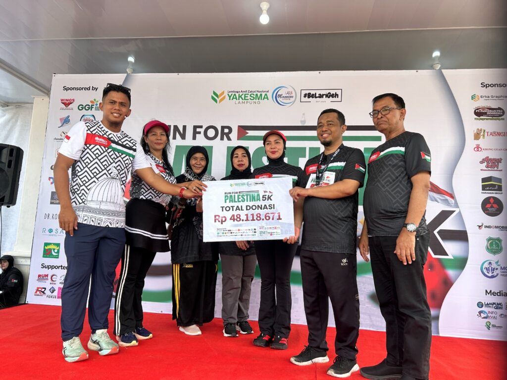 Alhamdulillah, dari langkah-langkah kebaikan ini terkumpul donasi dari event RUN FOR PALESTINE sebesar Rp 48.118.671 yang akan langsung disalurkan ke Palestina melalui Laznas Yakesma Lampung. Selain itu ada donasi Palestina sebesar Rp 10.000.000 dari Bapak Gubernur Rahmat Mirzani Djausal yang secara simbolis diserahkan oleh Ibu Purnama Wulan Sari Mirza (Ketua TP PKK Provinsi Lampung) yang diterima oleh Joko Setiono (Kacab Yakesma Lampung) dan Dr. Elida Purba, ST., M.Sc. (Ketua BE Runn3Rs Lampung) serta Johan Aditya Ramadhan (Ketua Pelaksana Charity RFP). Adapula donasi Palestina sebesar Rp 1.000.000 dari Bapak Ade Utami Ibnu (Wakil Ketua Komisi I DPRD Provinsi Lampung).