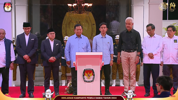 Jakarta – Komisi Pemilihan Umum (KPU) telah resmi membuka Deklarasi Kampanye Pemilu Damai 2024. Tiga pasangan calon presiden dan wakil presiden, yaitu Anies Baswedan-Muhaimin Iskandar (AMIN), Prabowo Subianto-Gibran Rakabuming, dan Ganjar Pranowo-Mahfud MD, turut serta dalam momen bersejarah ini. Pembukaan ditandai dengan penandatanganan dokumen oleh ketiga capres, dalam menciptakan suasana haru sekaligus bersatu dalam semangat pemilu agar tercipta kedamaian.