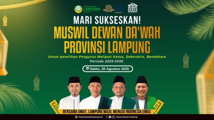 Bandar Lampung – Dewan Da’wah Provinsi Lampung akan menggelar Musyawarah Wilayah (Muswil) 2025 pada Sabtu, 30 Agustus 2025 di Gedung Meneng, Bandar Lampung. Forum lima tahunan ini menjadi ajang penting lahirnya kepemimpinan baru periode 2025–2030.