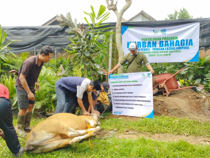 Bandar Lampung – Proses penyembelihan hewan Qurban LAZDAI dilakukan di beberapa titik, salah satunya di Gunung Terang, Bandar Lampung.