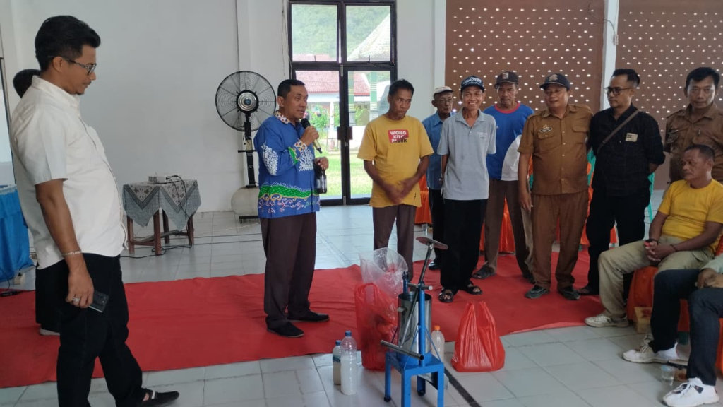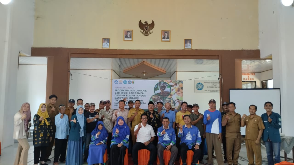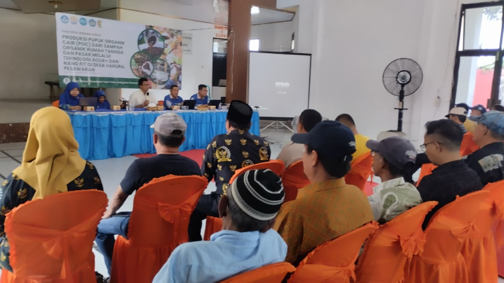 Pesawaran, Lampung – Universitas Lampung (Unila) menggelar kegiatan pengabdian kepada masyarakat di Desa Hanura, Kecamatan Teluk Pandan, Pesawaran, dengan memperkenalkan inovasi Pupuk Organik Cair Berbasis Bioenergi dari Sampah Organik menggunakan Teknologi Aqua+Nano Fit. Kegiatan ini berlangsung pada Selasa 12 Agustus 2025, dihadiri tim akademisi Unila yang terdiri dari Dr. Syaiful Bahri, M.Si (ketua), Prof. Dr. Sutopo Hadi, M.Sc., Lina Marlina, S.P., M.Si, dan Dr. Notiragayu, M.Si. Hadir pula Kepala Desa Hanura, ketua BPD, LPM, staf pemerintah desa, perwakilan ketua RT, serta puluhan warga yang mayoritas berprofesi sebagai petani dan pekebun.