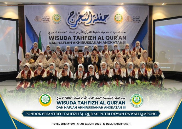 Bandar Lampung – Pondok Pesantren Tahfizh Quran (PPTQ) Putri Dewan Dakwah Lampung menyelenggarakan acara Wisuda Tahfizh Alquran dan Haflah Akhirussanah Angkatan 3 pada hari Ahad, 23 Juni 2024 atau 16 Dzulhijah 1445H di Hotel Sheraton yang beralamat di Jln. Wolter Monginsidi No. 175, Gulak Galik, Kec. Telung Betung Utara, Bandar Lampung.