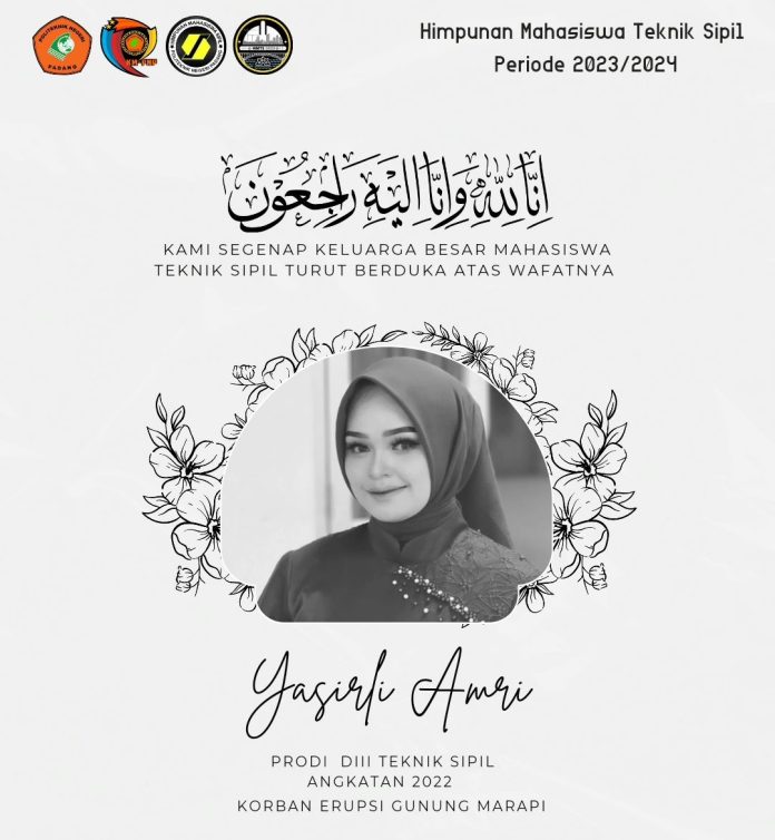 Tim DVI Polda Sumbar berhasil mengidentifikasi jasad Yasirli Amri, atau yang akrab dipanggil Sherly, pada Rabu malam. Proses identifikasi melibatkan tes sidik jari, pemeriksaan gigi, tahi lalat, tato, dan tanda-tanda lainnya. Hampir semua korban meninggal mengalami luka bakar pada berbagai bagian tubuh, menunjukkan keparahan letusan Gunung Marapi. Jasad Yasirli Amri, yang akrab dipanggil Sherly, telah diambil oleh pihak keluarga sekitar pukul 22.00 WIB pada malam itu. Direktur PNP menyatakan duka mendalam atas kehilangan mahasiswanya akibat letusan gunung merapi.